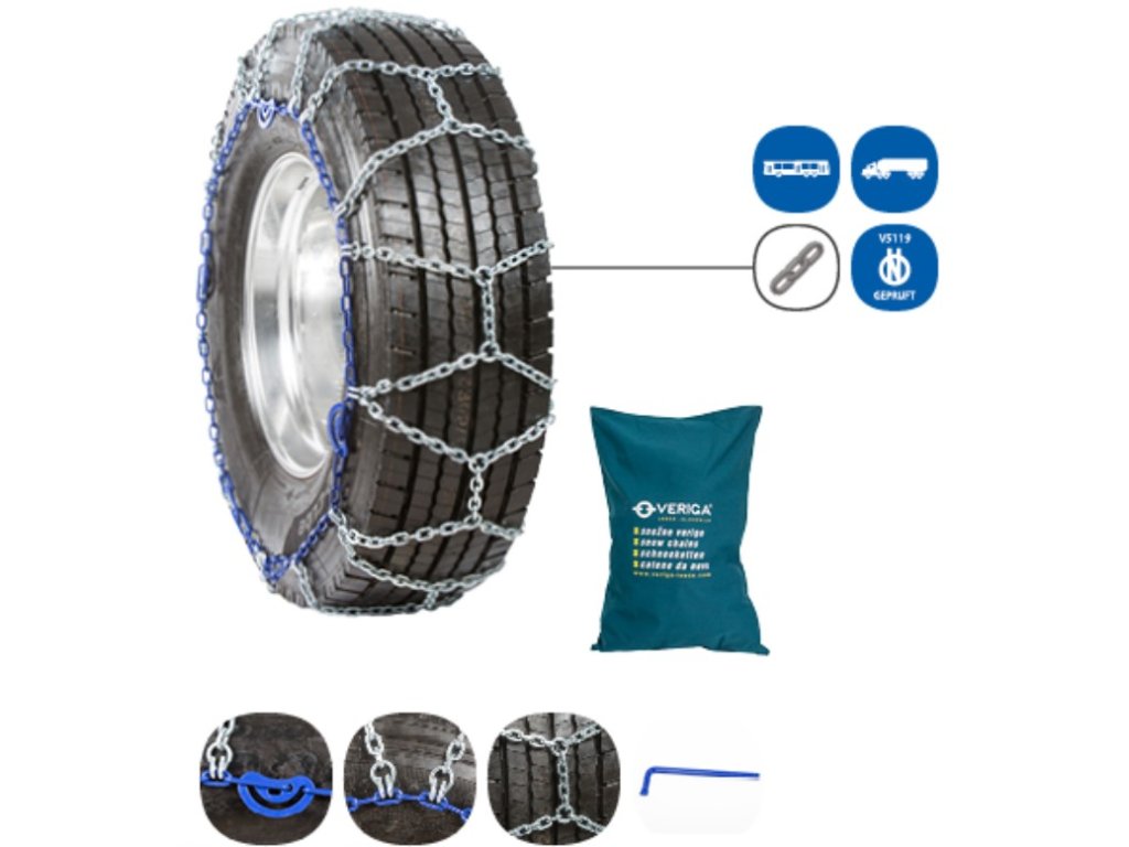 Řetěz pro nákladní vozy. Silný a spolehlivý. Průměr řetězu je 5,5 mm. Řetěz splňuje standard ON V5119. Řetězová síť je pozinkovaná, napínací obvodový řetěz je barvený na modro. Vyrobený ze speciální legované oceli a je tepelně zpracovaný tak, aby jeho životnost byla co nejdelší. Dodáváno v odolných látkových pytlích.