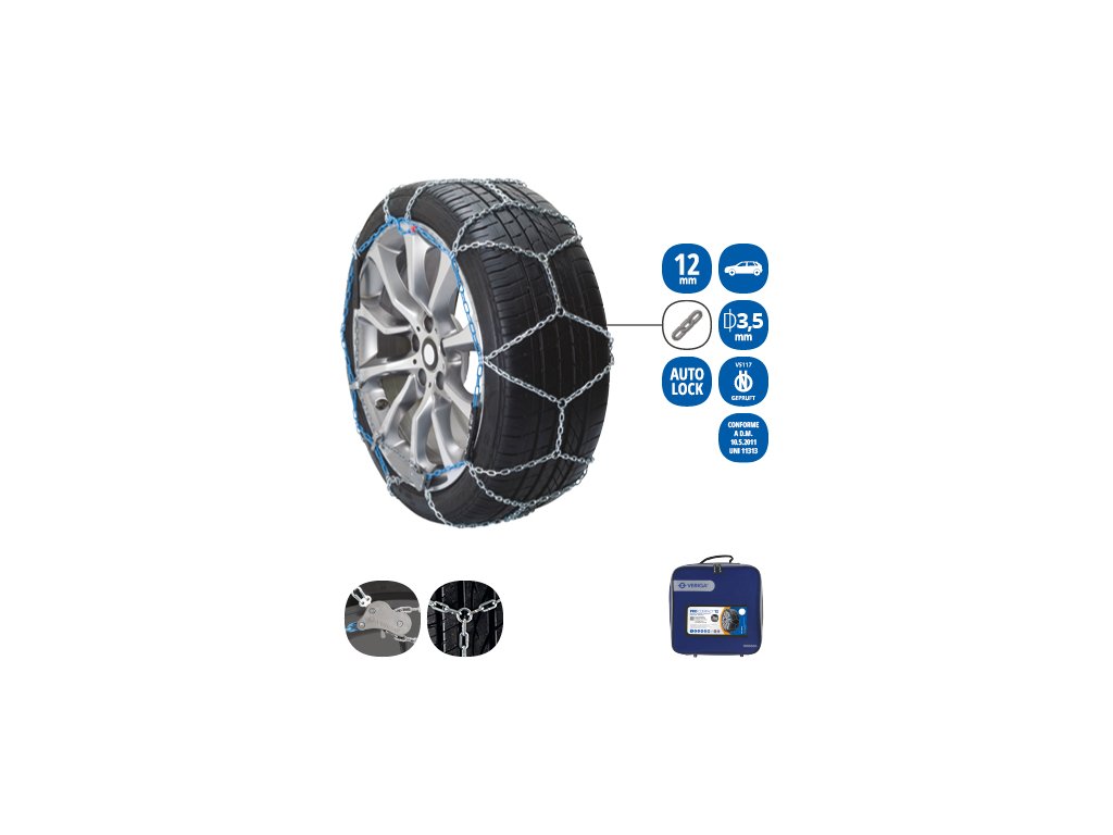 Řetěz je tvořený z článků ve tvaru "D" s průměrem 3,5 mm. Výška řetězu je 12 mm. Napínání řetězu je manuální. Je vhodný na jízdu na ledu a sněhu.