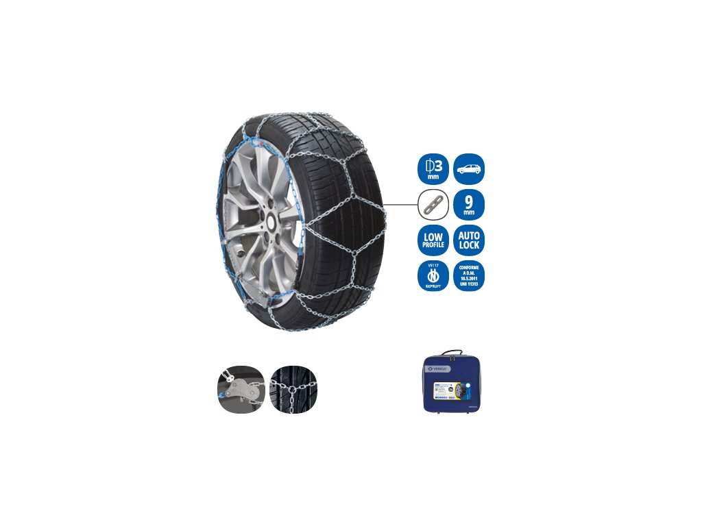Řetěz je tvořený z článků ve tvaru "D" s průměrem 3 mm. Výška řetězu je 9 mm. Napínání řetězu je manuální. Kvalitní řetěz s vysokou výdrží, spolehlivý i v nouzových situací.